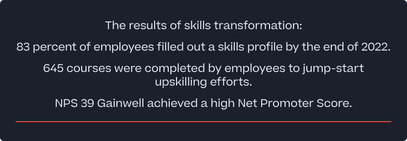 ChallengeGainwell needs to pivot quickly to win new projects, while filling positions and reducing turnover. To do that, the company had to become more agile, aligning employee development with strategic objectives. SolutionGainwell uses Cornerstone Skills Transformation for skill profiling, career pathing, training, and mentoring tools to close skill gaps and accelerate internal mobility. resultsGainwell identified the skills of 80 percent of its employees in less than six months. This led to greater workforce agility, allowing Gainwell to pivot quickly on projects and win new business.